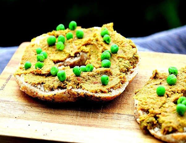 Erbsen auftauen lassen. Zwiebel schälen und in Würfel schneiden.