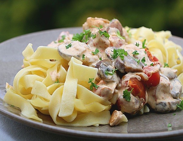 Pasta nach Packungsanleitung kochen. Die Champignon-Pfanne unter die