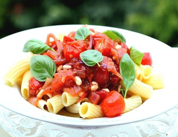 Zucker bestreuen und ca. 15min köcheln lassen. Die Pinienkerne in die Tomatensauce geben