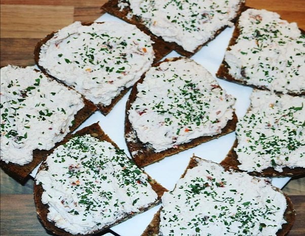 Brotscheiben mit der Creme bestreichen, Petersilie und Schnittlauch überstreuen und servieren