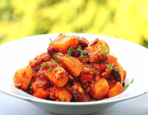 Kartoffeln pellen und in grobe Stücke schneiden. Kidneybohnen abtropfen lassen