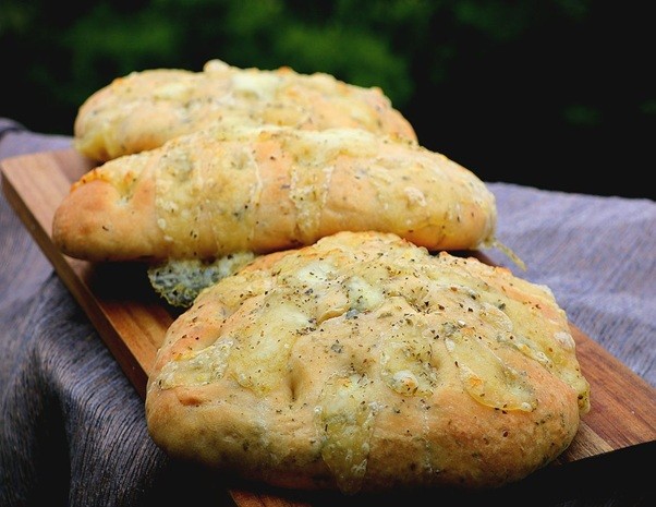 flach formen und mit dem Fingern Vertiefungen eindrücken. Die Fladen