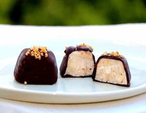 Das Eiskonfekt mit der Schokolade überziehen und sofort mit