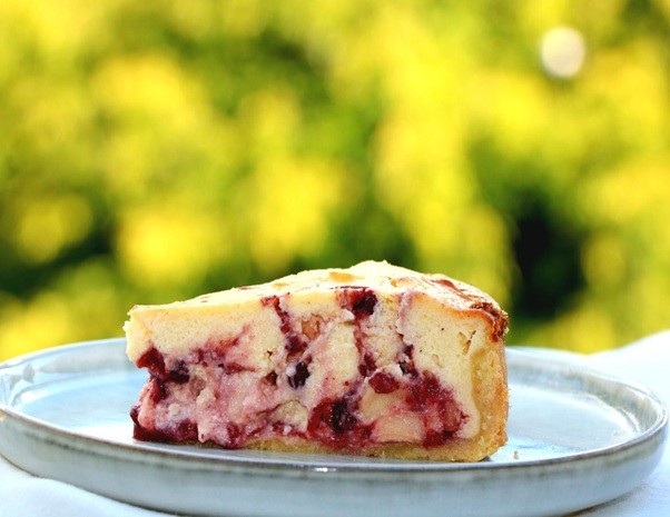 Käsekuchen mit Preiselbeeren und Apfel