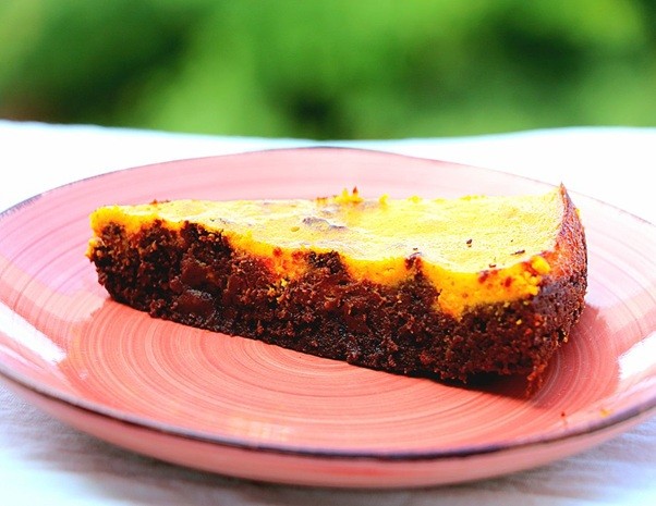 Kürbismasse auf den Teig geben und mit einer Gabel durchmarmorieren. Kuchen bei 180° ca. 25-30min backen.