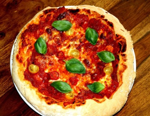 belegen. Pizza bei 220° im Ofen ca. 20-30min goldgelb backen. Pizza mit Basilikum garnieren.