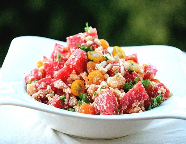 Wassermelonen Feta Salat mit Sweet Chili Dressing