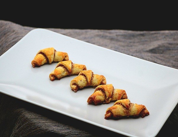 Teigstücke in 8 Kuchenstücke schneiden. Von der langen Seite her aufrollen.