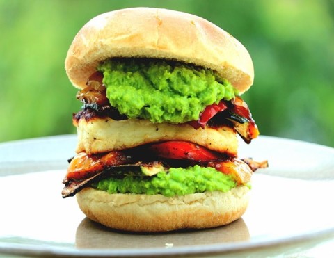 Die Burger mit dem Erbsendip besteichen und mit Halloumi und Anti-Pasti belegen.