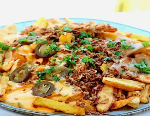erwärmen und mit Pommes, Röstzwiebeln und Jalapenos anrichten.