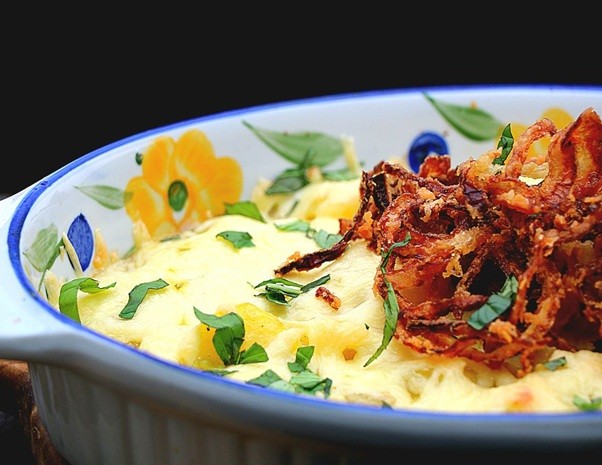 Die Sauce über die Kartoffeln gießen und mit dem Gauda bestreuen. Die Bèchamelkartoffeln