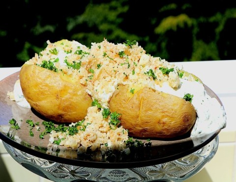 Kartoffeln der länge nach aufschneiden. Kartoffeln mit Sour Cream und