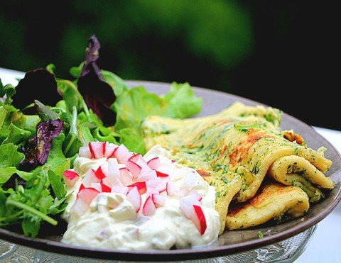 Kräuterpfannkuchen mit Salat und Dip