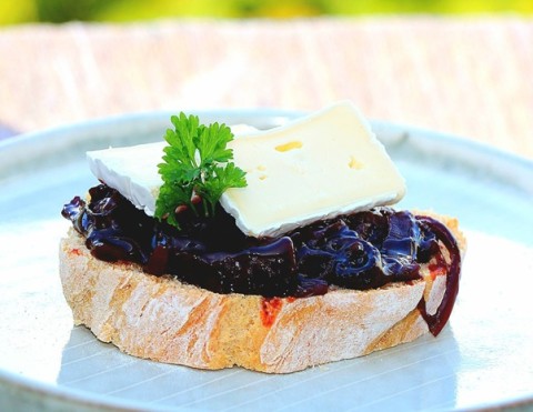 Baguettescheiben mit Olivenöl bestreichen und im Ofen rösten. Die Baguettescheiben mit der Marmelade